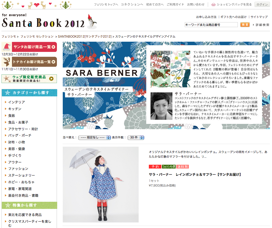 テキスタイルデザイナー「サラ・バーナー」のテキスタイルを使った商品が、カタログ通販の「フェリシモ」のSanta Book 2012のグッズとして発売中。 本物のスウェーデンテキスタイルデザインをクリスマスプレゼントとして大切な方に送ってみてはいかがでしょう? 詳細はフェリシモWebsiteをご覧下さい。