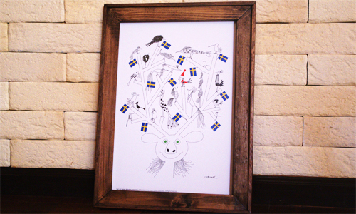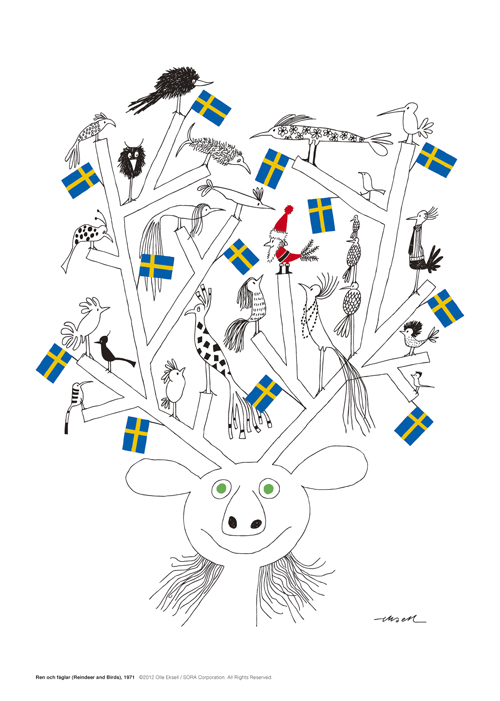 トナカイの角に集う鳥たちとスウェーデン国旗、そしてちょこんと、小さなサンタ・バードも。