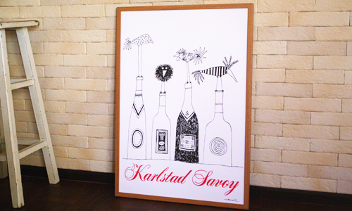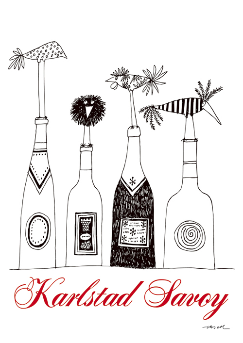 ストックホルムから西へ300km、ヴェーネルン湖畔の都市・カールスタッドにあったホテル[Savoy]のレストランのワインリストの表紙に採用された1955年作のイラストです。おなじみ、オーレさん描く空想の鳥たちが、ワインボトルを止まり木にしています。
